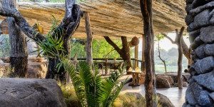 An einem der spektakulärsten Aussichtspunkte über dem Sand River steht ein neuer Pavillon, unter dem im Freien gespeist werden kann. Verschiedene nestartige Filzdecken, auf unterschiedlichen Höhen angebracht, wirken wie die Zweige eines Baumes, während Tische und Stühle auf unterschiedlich großen Rohholz-Decks stehen – perfekt für ein intimes Dinner und Entspannung am Pool. Licht spenden nestförmig gewebte Lampenschirme, ein in der Mitte stehender Kamin strahlt heimeliges Flair aus und treppenförmige Wasserläufe verleihen dem ganzen ein kühlendes, reflektierendes Element. Um jedem Gast einen optimalen Ausblick zu gewähren, sind die aus sandgestrahltem Treibholz gefertigten Tische entlang des Flussufers aufgereiht. Die Kupfervasen zieren gesammelte Zweige, Wildblumen und Gräser. Handgearbeitetes Besteck, ungleichmäßige Keramikteller und grobe Leinenservietten runden das rustikal elegante Ambiente ab.